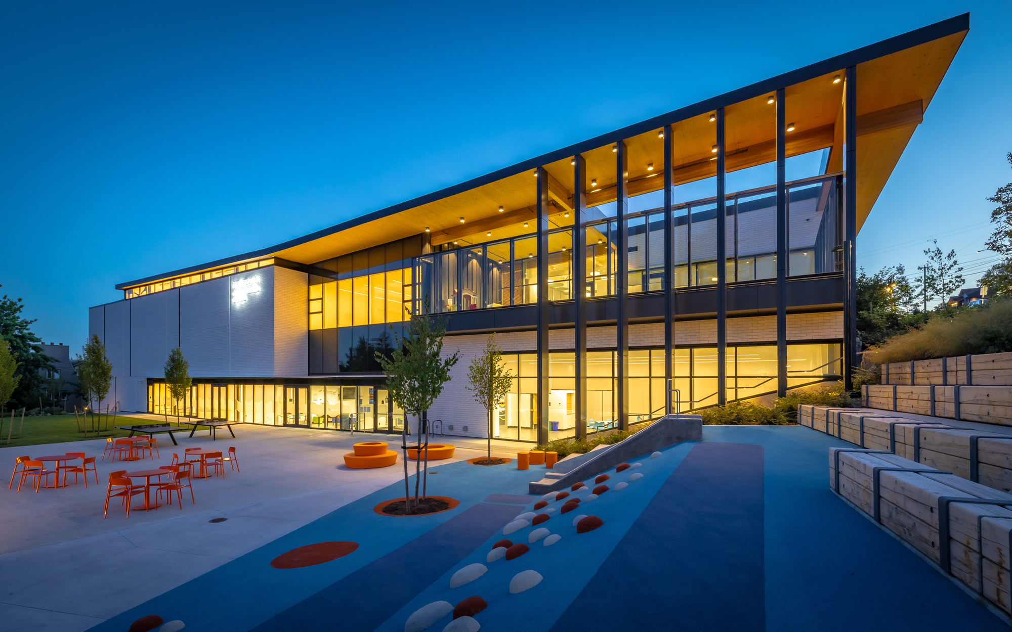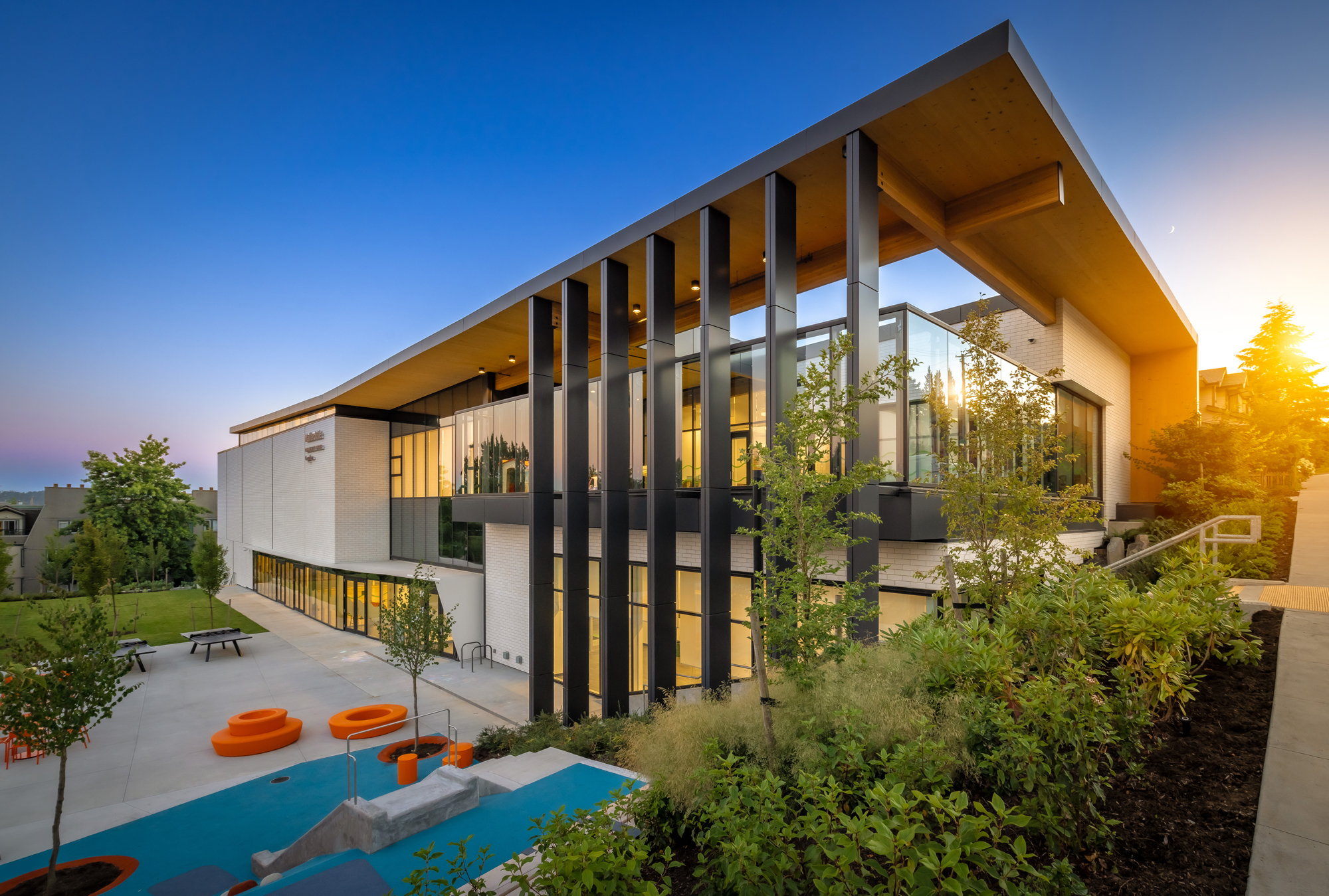 Place Maillardville Community Centre is a replacement facility for an existing community centre that has served the Maillardville District in Coquitlam for over 35 years. The facility houses several multipurpose rooms ranging from small meeting rooms to larger aerobic centred spaces with sprung floors (some of which are dividable with an operable partition), both a catering and a demonstration kitchen, a flexible intergenerational lounge for youths and seniors to gather, a gymnasium, child programming spaces, admin and support spaces, and an underground parkade. The project was required to be constructed adjacent to the existing community centre while maintaining existing operations and key community programs The extreme proximity (1.2m) of the existing facility meant that careful consideration had to be given to the continued operation of the existing facility. The design team worked in close collaboration with the existing buildings operators, the City of Coquitlam, and the general contractor, to ensure that constructability and phasing of the new build was considered, and the operations (including summer camps for youth) were maintained all on the same site.